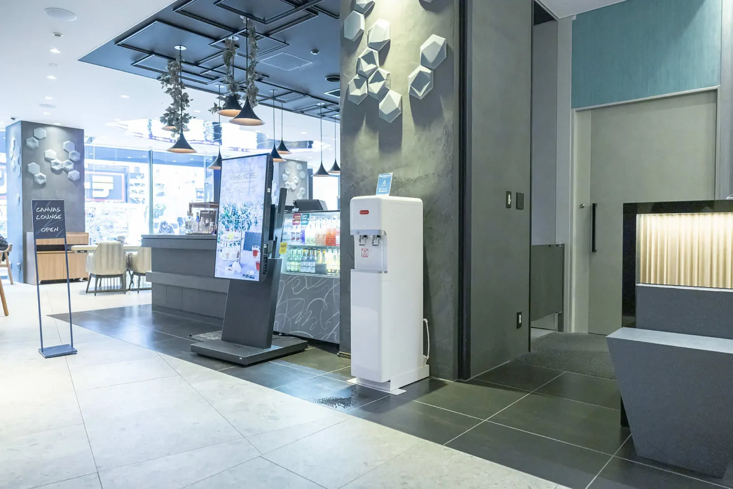 「以前はペットボトルの水を提供していましたが、消費本数が、全店舗でなんとひと月に約6,000本。ウォーターサーバーを設置して、マイボトル制に切り替えることで、環境負荷を減らそうという目的がありました」