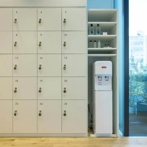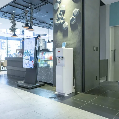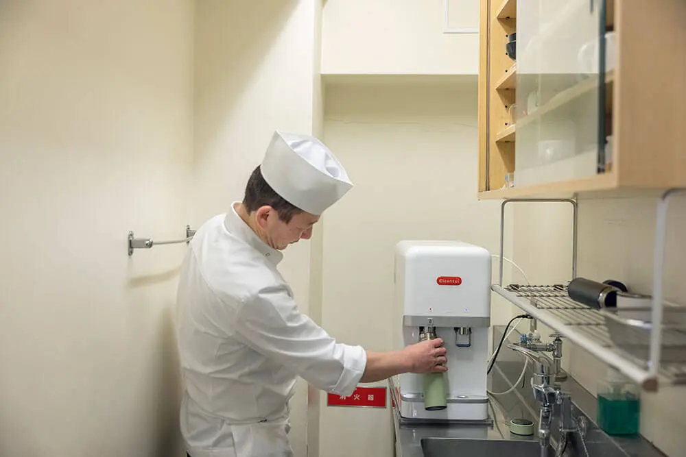 水道水に含まれる微粒子、雑菌、赤さび等を除去し、水道水のミネラルはそのままに冷水、温水として提供されます。