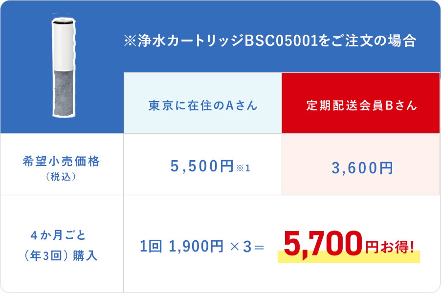 ※1クリンスイ公式オンラインストアでお買い求めの場合定期配送会員Bさんが
