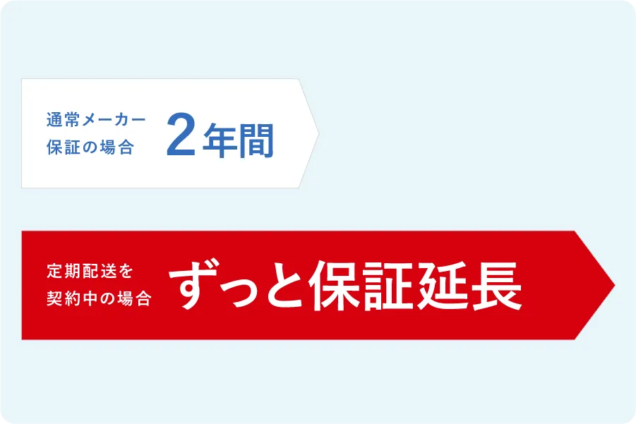 通常メーカー保証2年のところ、浄水カートリッジ定期配送会員様は定期配送契約中に限り本体保証がずっと延長します。