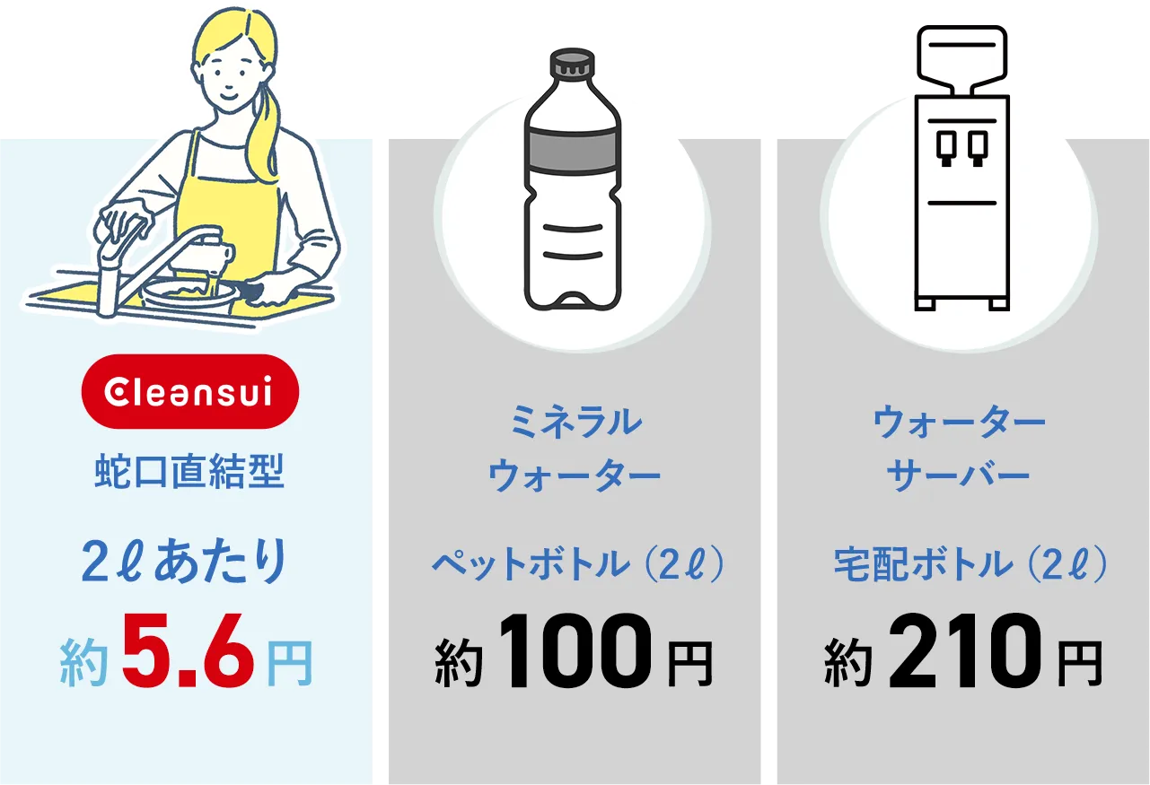 一般的なボトル(1本12L)を毎月5本利用するものとし、月額6,300円基準に2Lあたりの単価を算出しております。サーバーを利用する電気料金は含んでおりません。
